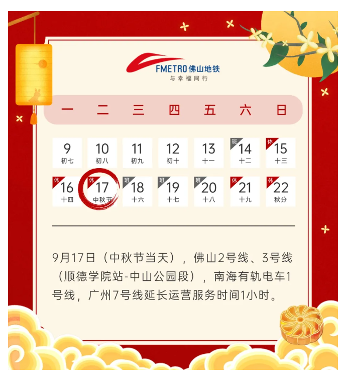 其中,9月17日(中秋当天)佛山2号线、3号线(顺德学院站-中山公园段),南海有轨电车1号线,广州7号线延长运营服务时间1小时。