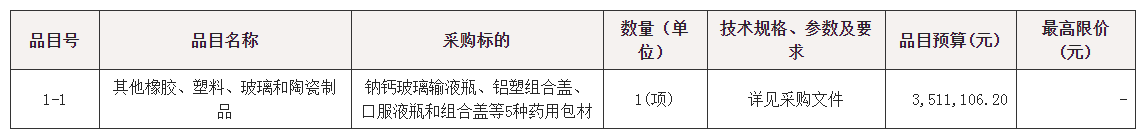 项目名称:制剂中心钠钙玻璃输液瓶、铝塑组合盖、口服液瓶和组合盖等5种药用包材(二次)
