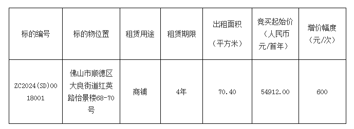 广东托信项目管理有限公司(以下简称:交易代理机构)受佛山市顺德区飞鹅永久墓园管理处(以下简称:出租方)委托采用网上竞价方式,对大良红英路怡景楼68-70号商铺出租项目(项目编号:ZC2024(SD)0018)进行网上公开竞价,欢迎合格的竞价人参与竞价。