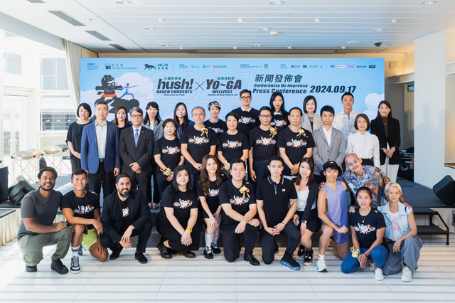 “hush! 沙滩音乐会 x Yo~ga 瑜伽运动节 2024”新闻发布会于9月17日在澳门美高梅维天阁举行,澳门特别行政区政府文化局局长梁惠敏、美高梅中国控股有限公司总裁及执行董事冯小峰、澳门特别行政区政府旅游局代局长程卫东、澳门特别行政区政府市政署文康及公民教育厅厅长高佩珊、澳门特别行政区政府海事及水务局海事活动厅厅长黄文涛等主礼,澳门特别行政区政府文化局副局长郑继明及美高梅品牌策划高级副总裁廖颕琦等出席。会上邀请澳门林泽诚爵士乐队及thetiredeyes乐队与水上瑜伽导师 Vicky Yang及 Victor Chau 进行联乘演出。