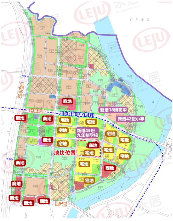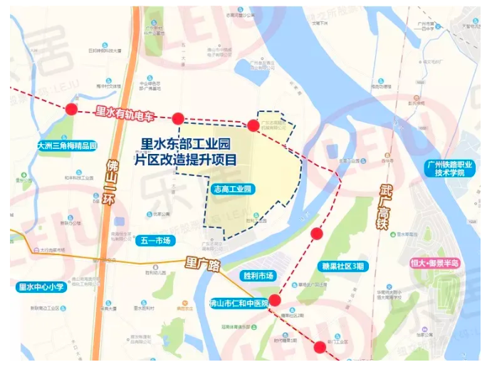 从地块位置看,该地块位于里水东部板块,地理位置优越,紧邻广州金沙洲,南侧是原志高工业园,周边建有南海有轨电车里水示范段,还规划有佛山地铁8号线,距离在建的有轨电车东秀路站南侧约300米。