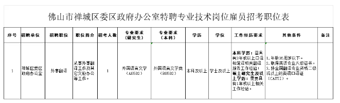 特聘专业技术岗位雇员1名,详见《 佛山市禅城区委区政府办公室特聘专业技术岗位雇员招考职位表》。