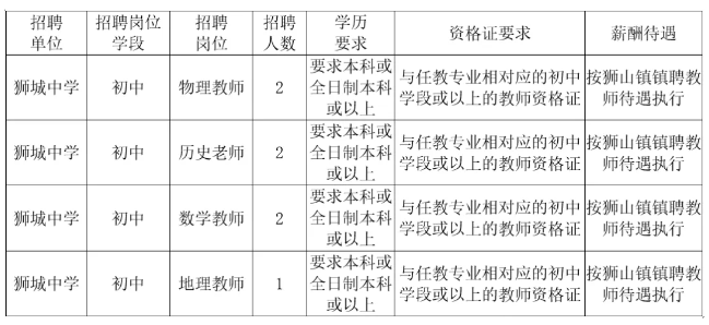 初中镇聘教师7名,其中物理、历史、数学教师各2名,地理教师1名。