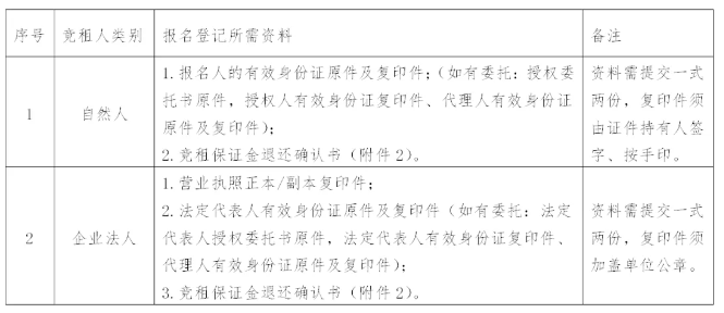 2.公司法人:需携带加盖单位公章的营业执照正本/副本复印件、法定代表人身份证原件(若授权委托他人参加竞租的,委托代理人须提交法定代表人授权委托书原件、法定代表人身份证复印件、委托代理人身份证原件及复印件,且所有复印件资料一式两份并加盖单位公章)及竞租保证金汇款或转账凭证单据原件给南山公投公司核查。
