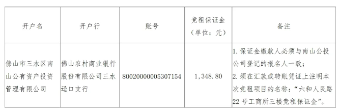 (二)竞租保证金缴纳:经南山公投公司审查符合竞租条件并作竞租意向报名登记成功的意向竞租者,请于2024年9月27日(星期五)17:00前将竞租保证金汇入佛山市三水区南山公有资产投资管理有限公司银行账户: