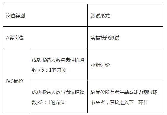 (3)基本能力测试主要采取实操技能测试、小组讨论等形式对考生进行考察。各岗位具体考核形式见下表。
