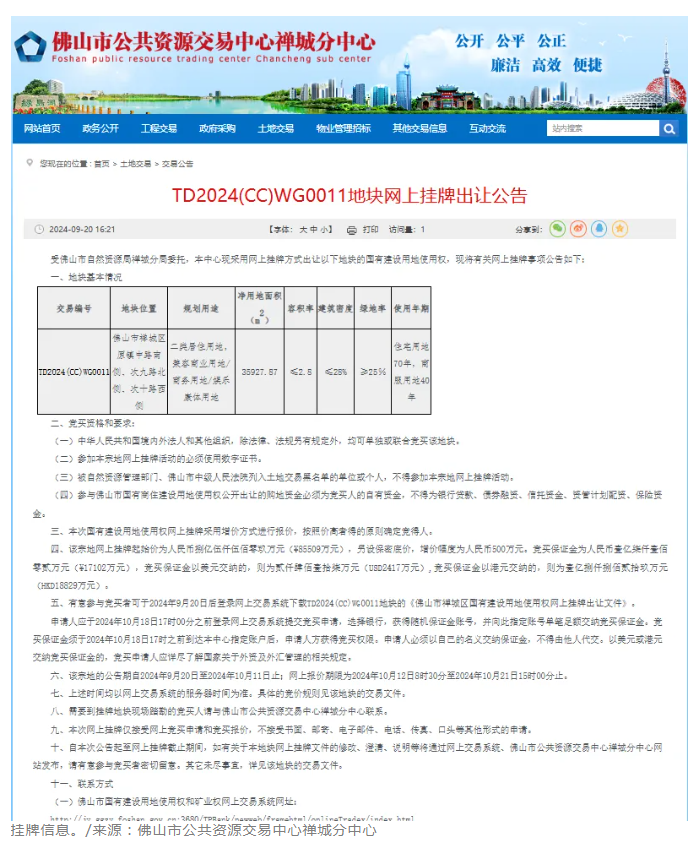 9月20日,佛山市公共资源交易中心禅城分中心公开佛山左岸文化艺术走廊1号地块挂牌出让公告。
