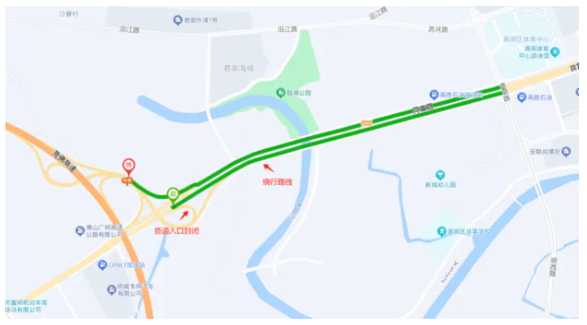 行驶G9411莞佛高速荷城站入口匝道(富湾往荷城方向)的车辆,可绕行荷富路,从荷城往富湾方向的入口匝道进入荷城站。