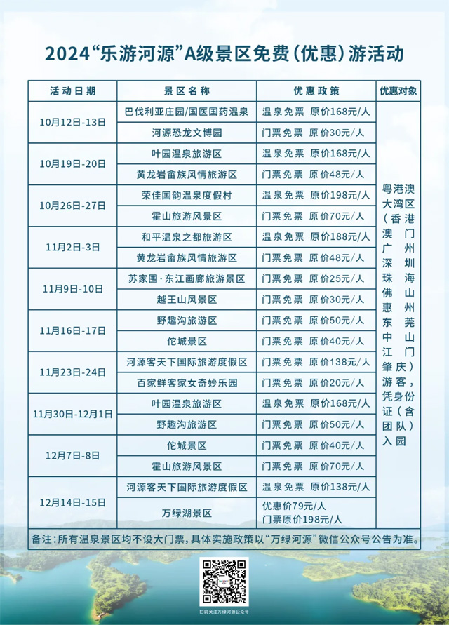 河源国家A级旅游景区,轮流对大湾区居民免费开放