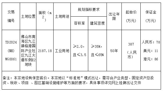 八、自本次公告起至网上挂牌截止期间,如有关于本宗地竞买文件的修改、澄清、说明等将通过网上交易系统以及佛山市南海区人民政府网发布,请有意参与竞买者密切留意。其它未尽事宜,详见本宗地的网上挂牌出让文件。