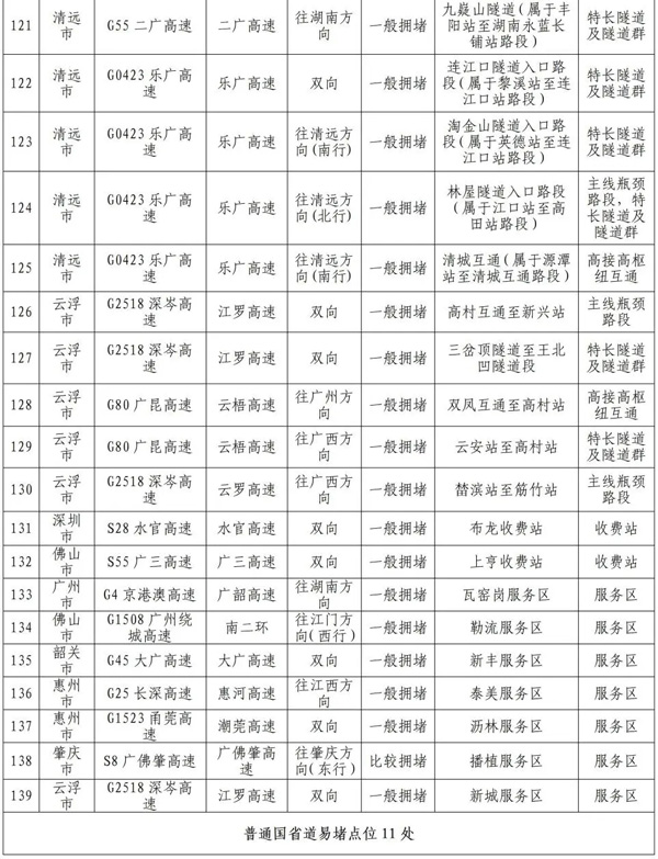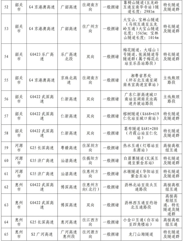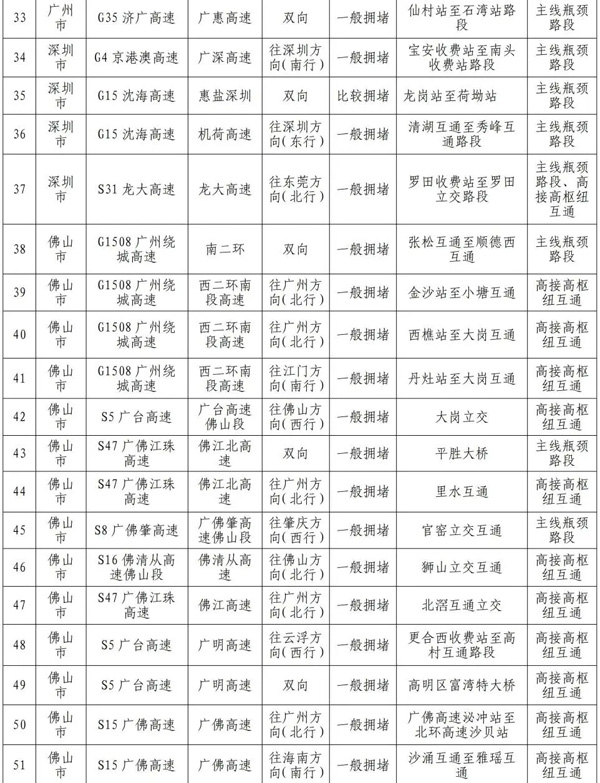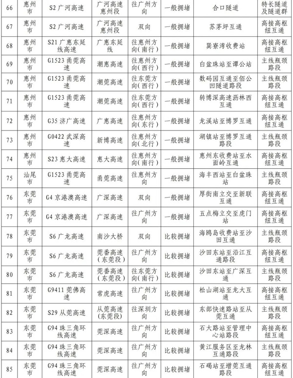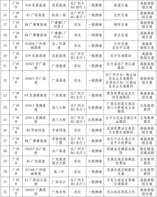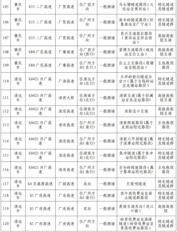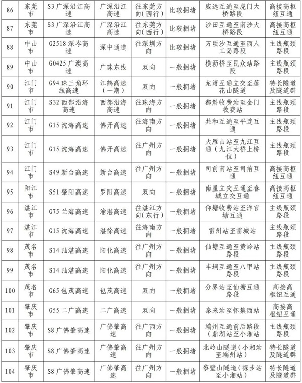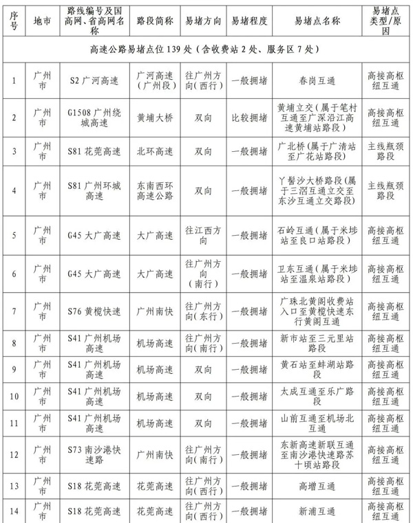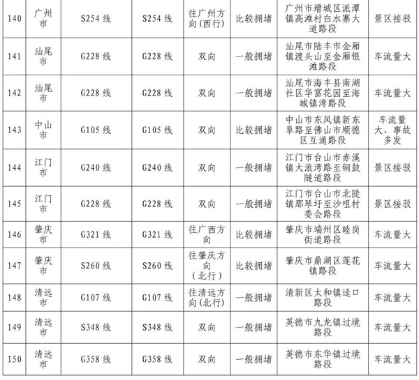 预计繁忙路段一览表