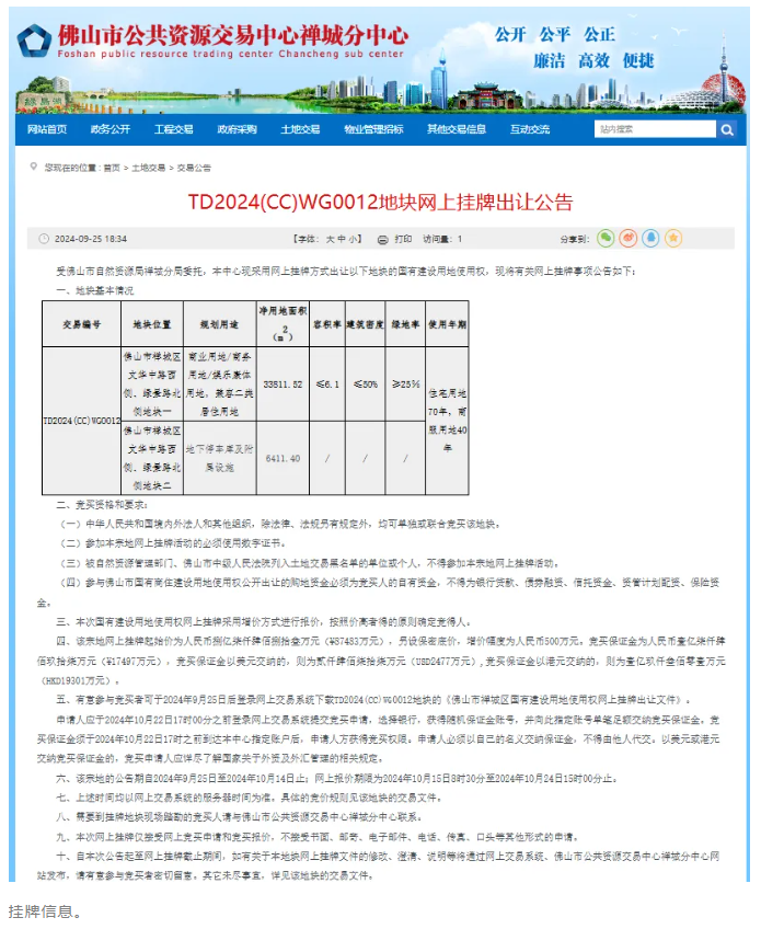 9月25日,佛山市公共资源交易中心禅城分中心公开仁和仁伍地块挂牌出让公告。