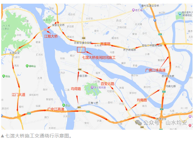 施工期间对七滘大桥进行全封闭,除执行紧急任务的军车、警车、消防车、救护车、工程救险车以及非机动车和行人可通行外,其余车辆均需绕道行驶。
