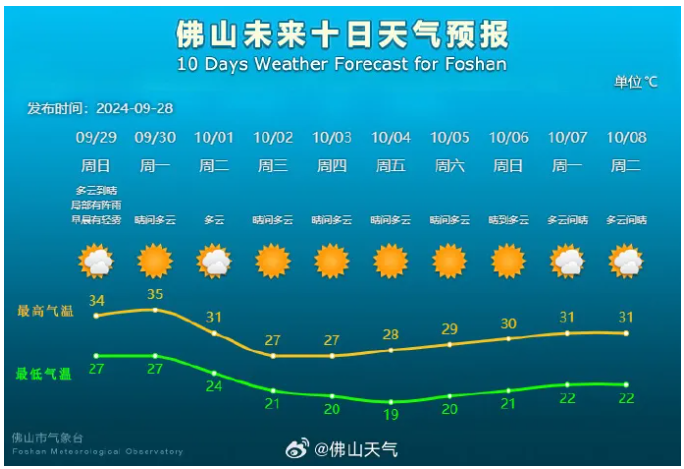 佛山市气象台预计,9月29、30日佛山多云到晴,局部有阵雨,天气炎热,最高气温35℃左右。国庆前中期受中等强度冷空气影响,北风加大,气温下降,预计过程最低气温19℃左右。