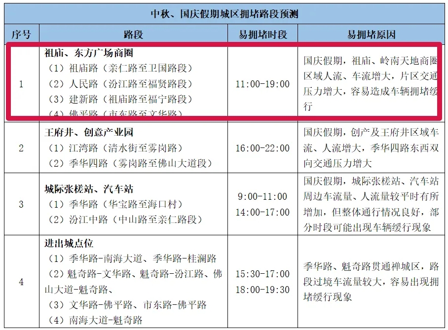 结合往年国庆期间城区道路运行情况,预测国庆假期城区易拥堵缓行路段主要集中在祖庙、东方广场商圈、创产王府井、城际张槎站及进出城点位等区域,分布在建新路、祖庙路、人民路、城门头路、季华四路、季华六路、魁奇路等路段,城区主干道通行情况相对较好,整体路网运行情况良好。建议市民出行时提前规划路线,避免拥堵,或选择公共交通出行。