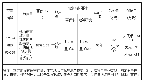 经佛山市人民政府批准,佛山市自然资源局决定委托佛山市公共资源交易中心南海分中心采用网上挂牌方式出让下列地块的国有建设用地使用权。现将有关事项公告如下:
