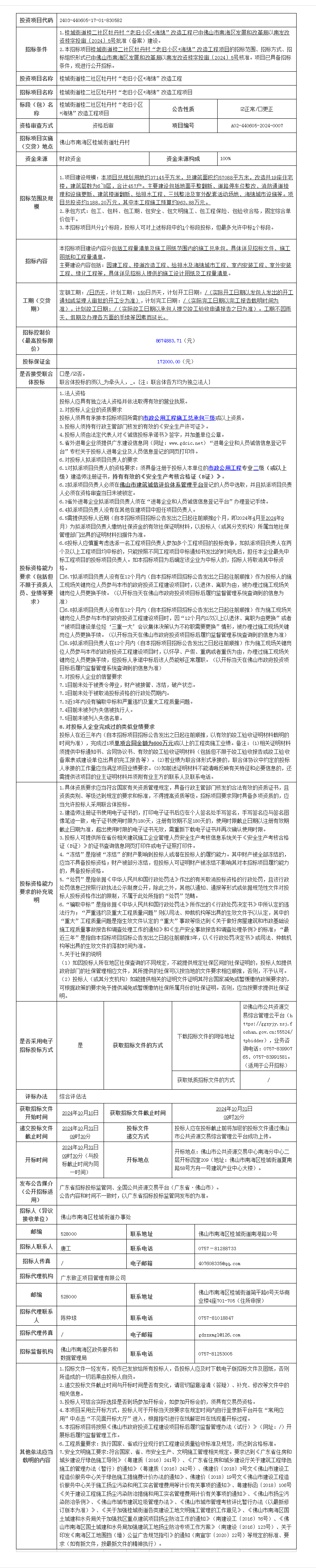 概述:本招标项目桂城街道桂二社区牡丹村“老旧小区+海绵”改造工程项目的招标范围、招标方式、招标组织形式已由佛山市南海区发展和改革局以南发改资桂字投审〔2024〕5号核准......