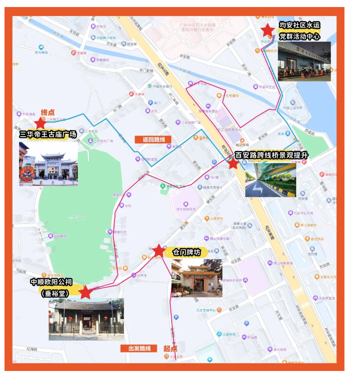 出发:仓门土庙会馆—仓门牌坊村口—建安路—三华垂裕堂—三华浩川祖—三华步行街—锦安路—百安路(宏安路跨线桥红绿灯)—祈安路三华新村—均良路—水运文化中心(稍作停留)。