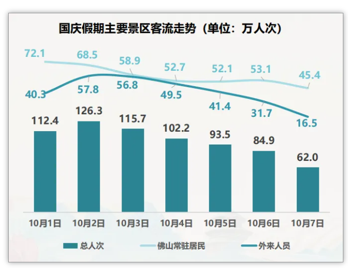 报告显示,国庆期间,佛山主要景区客流量的高峰期是10月1日至10月3日,在10月2日达到顶峰。