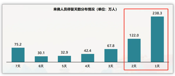 从时间上看,来佛游客以1-2天的短期游为主。对很多游客来说,两天的旅游也足以覆盖祖庙博物馆、西樵山、清晖园等佛山知名景点。