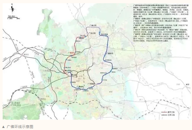 根据规划,广佛环线将衔接广珠城际、广佛江珠城际、穗莞深城际、佛莞城际、莞惠城际、广清城际、佛肇城际等七条放射状城际线,是珠三角城际通往东西方向交通干线的关键线路。