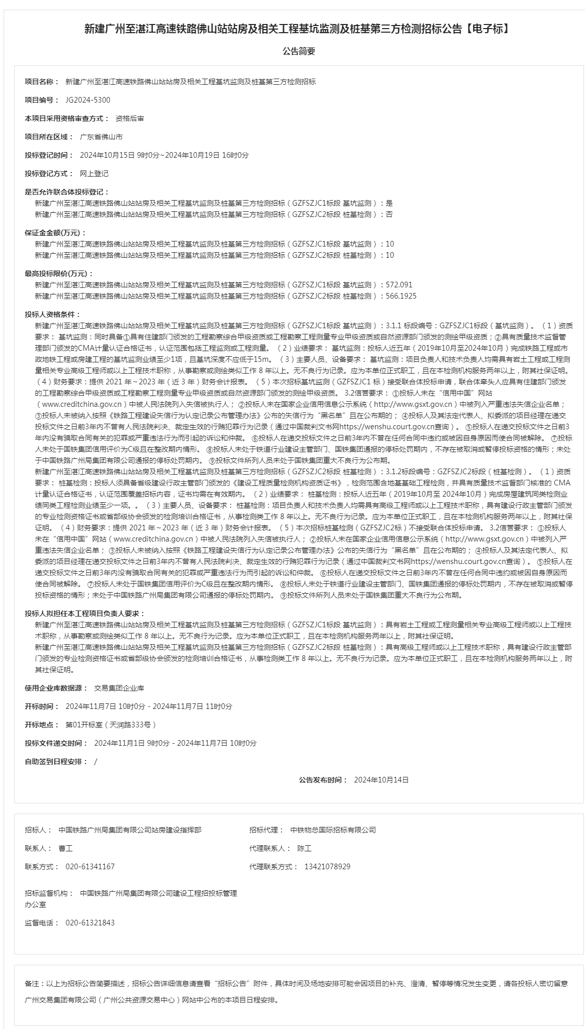 新建广州至湛江高速铁路佛山站站房及相关工程基坑监测及桩基第三方检测招标