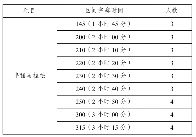 本次赛事招募半程马拉松官方配速员30人,具体配速分配如下: