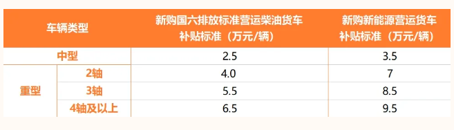 其中,新购国六排放标准营运柴油货车或新能源营运货车补贴标准见下表。