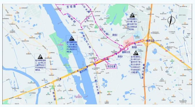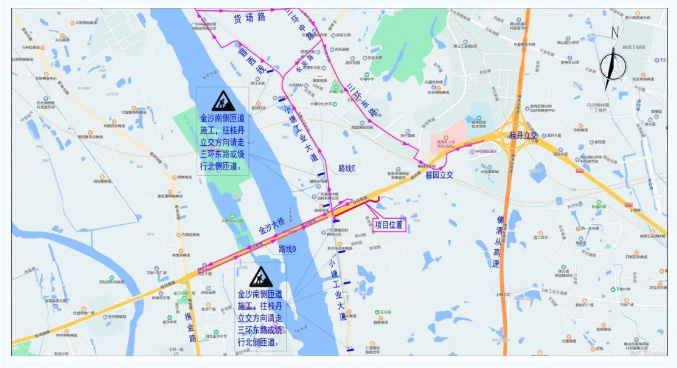 2.国道G359线金沙大桥匝道(小塘新桂路)占道施工期间,小塘工业大道东行车辆由本匝道进入桂丹路车辆分流路线如下: