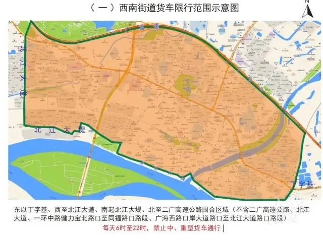 在常住人口最多的西南街道,货车限行范围东以丁字基、西至北江大道、南起北江大堤、北至二广高速公路围合区域(不含二广高速公路、北江大道、一环中路健力宝北路口至同福路口路段、广海西路口岸大道路口至北江大道路口路段),每天6时至22时,禁止中、重型货车通行。