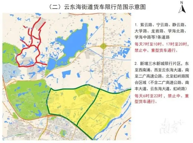 此次,该街道还新增三水新城限行片区,东至西南涌、西至云东海大道、南至二广高速公路、北至虹岭路围合区域(不含二广高速公路、南丰大道、云东海大道、虹岭路),每天6时至22时,禁止中、重型货车通行。