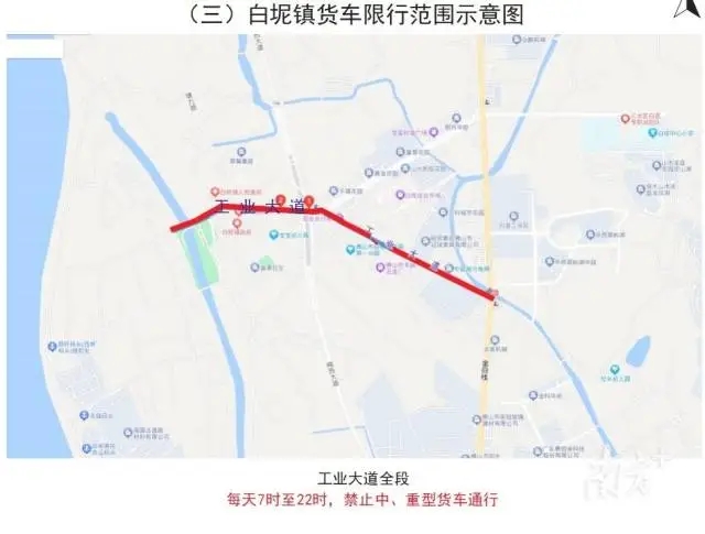 白坭镇货车限行范围,则是工业大道全段,每天7时至10时、17时至 20时,禁止中、重型货车通行。