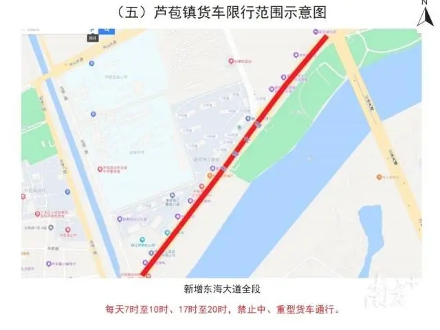 大塘镇的货车限行范围则新增永新街全段,每天7时至10时、17时至20时,禁止中、重型货车通行。