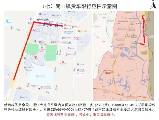 南山镇的货车限行范围拟新增越侨路全段、漫江大道升平酒店至侨兴路口路段、乡道Y705线K0+000M至K2+350M(即坳梁线坳头村至红联村路段)、村道 C256 线 K0+000M 至 K1+670M(即南红线红联村至漫江大道路口路段),每天18时至次日6时,禁止中、重型货车通行。