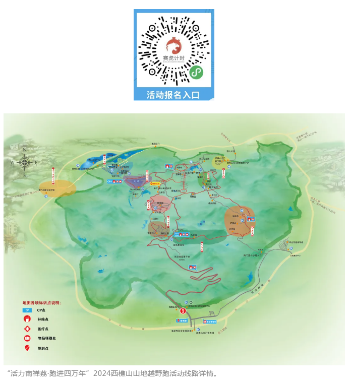 本次西樵山山地越野跑活动起点设在西樵山南门牌坊,终点为樵CAMP营地,全程18.68公里,途径西樵山石燕岩、飞越丛林、天湖、云海莲台等20多处景点、新文旅项目、古村。