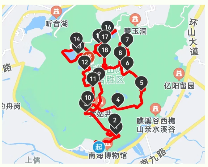 西樵山南门牌坊(起点)→九龙岩→石燕岩→石牌村→傅氏山庄牌坊→碧云村→白山村→翠岩→无叶井→四方竹→茶花园→桃花园→云路村→飞越丛林→亦有亭→天湖→亦有亭梅花古道→石牌村→宝峰寺→云海莲台→樵CAMP营地(终点)。