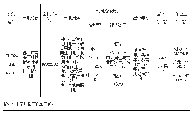 经佛山市人民政府批准,佛山市自然资源局决定委托佛山市公共资源交易中心南海分中心采用网上挂牌方式出让下列地块的国有建设用地使用权。现将有关事项公告如下: