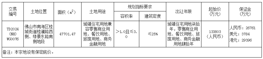 九、自本次公告起至网上挂牌截止期间,如有关于本宗地竞买文件的修改、澄清、说明等将通过网上交易系统以及佛山市南海区人民政府网发布,请有意参与竞买者密切留意。其它未尽事宜,详见本宗地的网上挂牌出让文件。