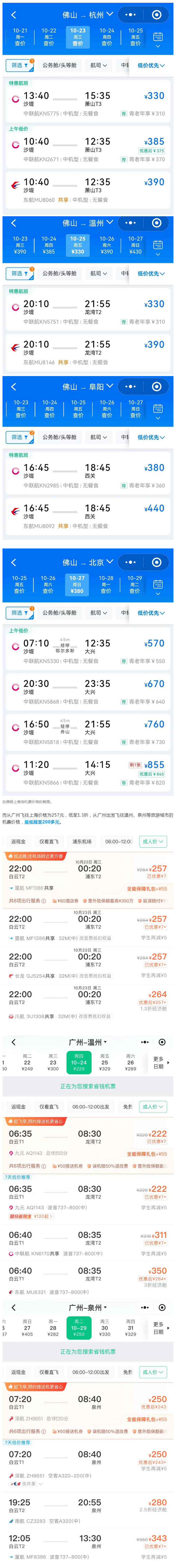 其中,从佛山飞往杭州、温州的价格低至330元,飞往阜阳的价格低至380元,飞往北京的价格低至570元。