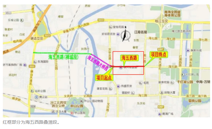 根据规划,佛山市的中央活力区,由祖庙-环文华公园、千灯湖、广湛高铁佛山站片区组成。海五西路叠滘段西端毗邻祖庙街道、广湛高铁佛山站片区,东端连接千灯湖片区。打通海五西路叠滘段,便成为推进禅桂一体化,打造中央活力区的关键。为此,双方的合作明确将海五西路项目作为重点推进。