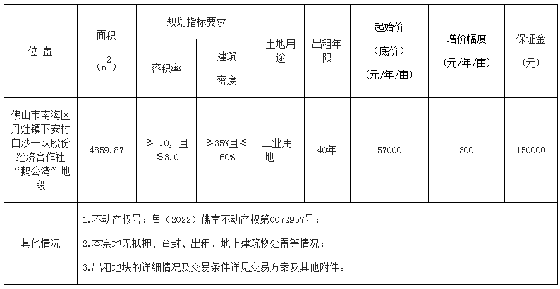 八、自本次公告起至网上挂牌截止期间,如有关于本地块网上挂牌出租文件的修改、澄清、说明等将通过上述网上交易系统、佛山市南海区人民政府网发布,不再另行通知,请有意参与竞租者密切留意。其它未尽事宜,详见本地块的网上挂牌出租文件。