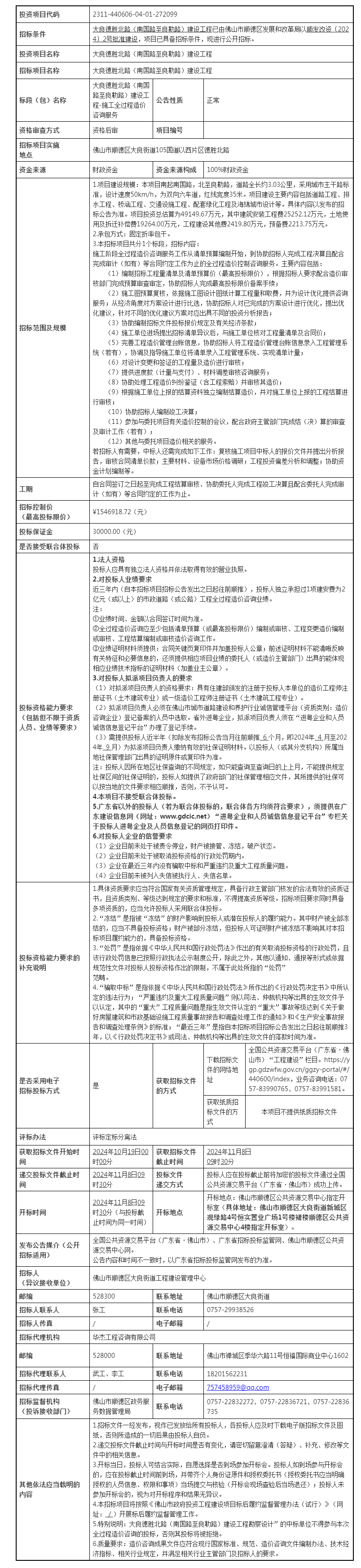 顺德区大良良德胜北路(南国路至良勒路)建设工程-施工全过程造价咨询服务招标公告