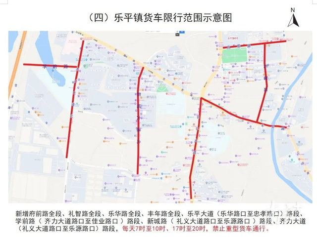 乐平镇是三水区“工业第一镇”,货车需求较多,为此该区域限行范围新增府前路全段、礼智路全段、乐华路全段、丰年路全段、乐平大道(乐华路口至忠孝路口)路段、学前路(齐力大道路口至佳业路口)路段、新城路(礼义大道路口至乐源路口)路段、齐力大道(礼义大道路口至乐源路口)路段,每天7时至10时、17时至20时,禁止重型货车通行。