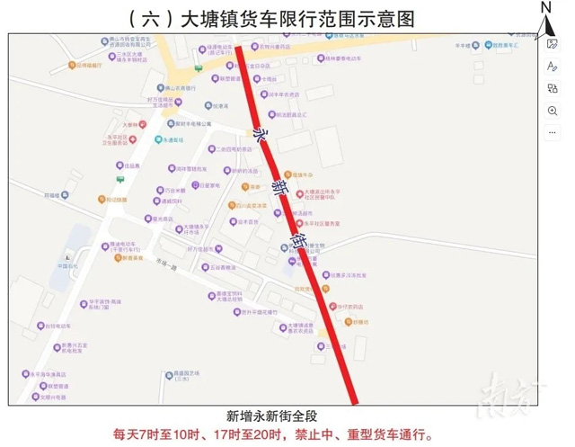 大塘镇的货车限行范围则新增永新街全段,每天7时至10时、17时至20时,禁止中、重型货车通行。