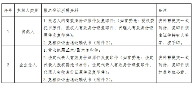 1.自然人:竞租人需携带本人有效身份证原件(若授权委托他人参加竞租的,委托代理人须提交授权委托书原件、授权人身份证复印件、委托代理人身份证原件及复印件,且所有复印件资料一式两份,复印资料须由证件持有人签名并加盖指纹)及竞租保证金汇款或转账凭证单据原件给南山公投公司核查。