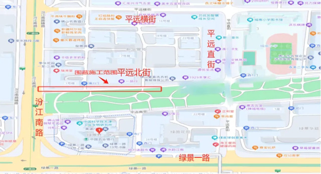 施工期间机动车绕行路线:汾江南路——影萌路——平远直街。