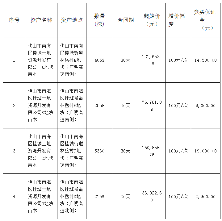 3.苗木价款收取方式:签订合同之日起 3 天内,竞得人按照成交价一次性向出售人全额支付,竞得人还需同时支付成交价的20%作为合同履约保证金。