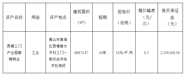 备注:项目物业(厂房/宿舍)共69874.87㎡,其中四层厂房4栋、十层宿舍1栋;租期10年,其中装修免租期6个月;合同履约保证金为成交价的3个月租金。