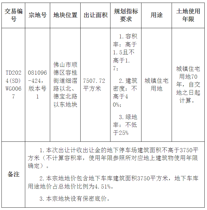 十一、自本次公告起至网上挂牌截止期间,如有关于本地块网上挂牌文件的修改、澄清、说明等将通过网上交易系统、佛山市顺德区公共资源交易中心网站发布,请有意参与竞买者密切留意。其它未尽事宜,详见该地块的交易文件。