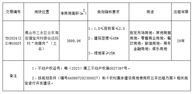 五、有意参与竞租者可于2024年10月25日后登录网上交易系统下载TD2024(SS)WG0007地块的《佛山市三水区农村集体经营性建设用地使用权网上挂牌出租文件》。